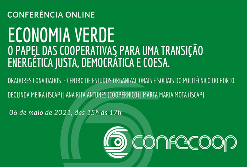 No próximo dia 6 de maio (quinta-feira), entre as 15h e as 17h, ira ser realizada uma conferência online que abordará o tema da ECONOMIA VERDE – O PAPEL DAS COOPERATIVAS PARA UMA TRANSIÇÃO ENERGÉTICA JUSTA, DEMOCRÁTICA E COESA.